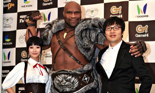 Korean MMO giant, Nexon, is currently on a roll at this year’s G*Star convention. Besides Mabinogi Heroes bagging the prestigious Korea Game Award, the highly anticipated character, Kalok (Karok in Vindictus), did not fail to impress the crowd with its latest trailer. Endorsing the game will be former wrestler and current mixed martial artist and kickboxer, Bob Sapp. Look at how big he is! His resemblance to Kalok makes me wonder if Nexon modeled the character after him 😀
